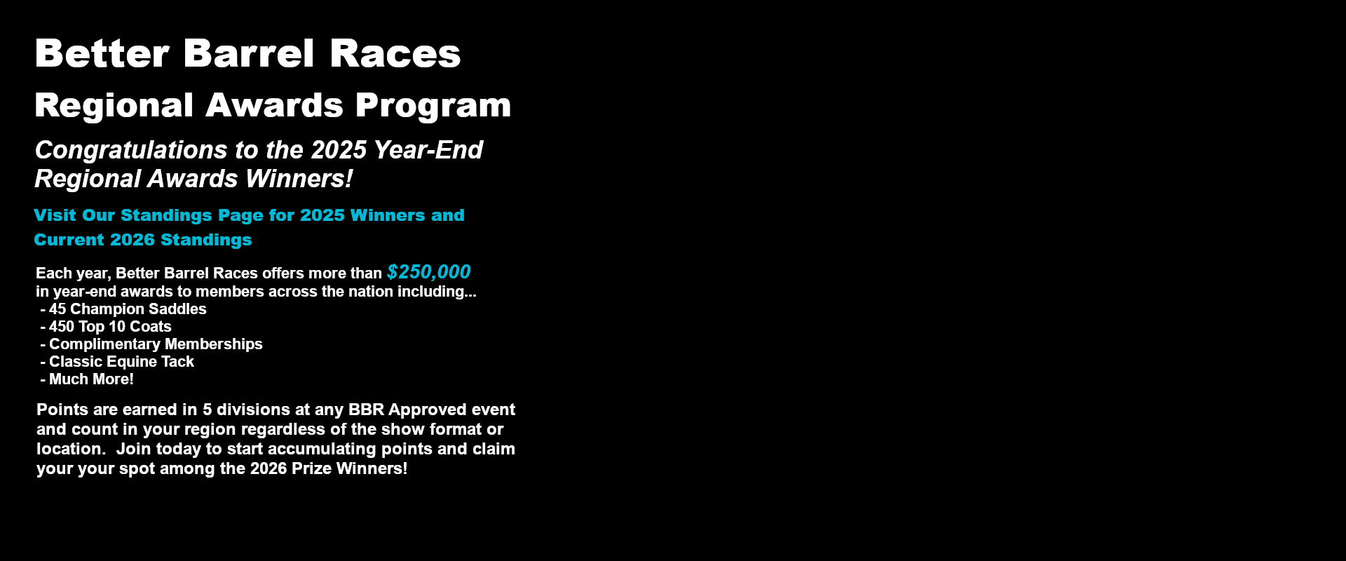 Each year, Better Barrel Races sanctions over 2,200 divisional, futurity and rodeo competitions across the nation! In addition to the money and prizes provided by each of these independent producers, BBR Members can earn credit towards qualificaiton for the BBR World Finals and earn points for the BBR Regional Standings. By looking for the BBR Stamp of Approval, barrel racers can rest assured they are participating in a Better Barrel Race.